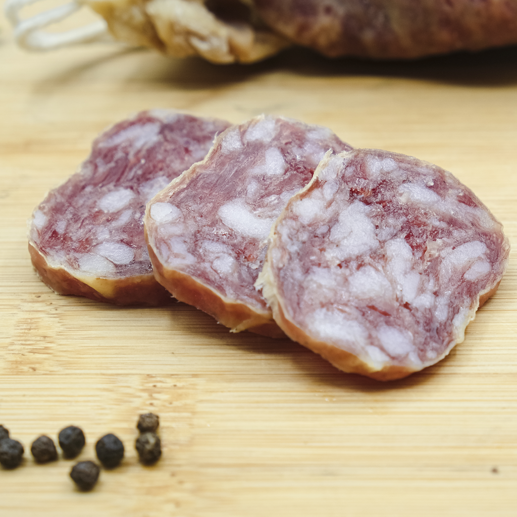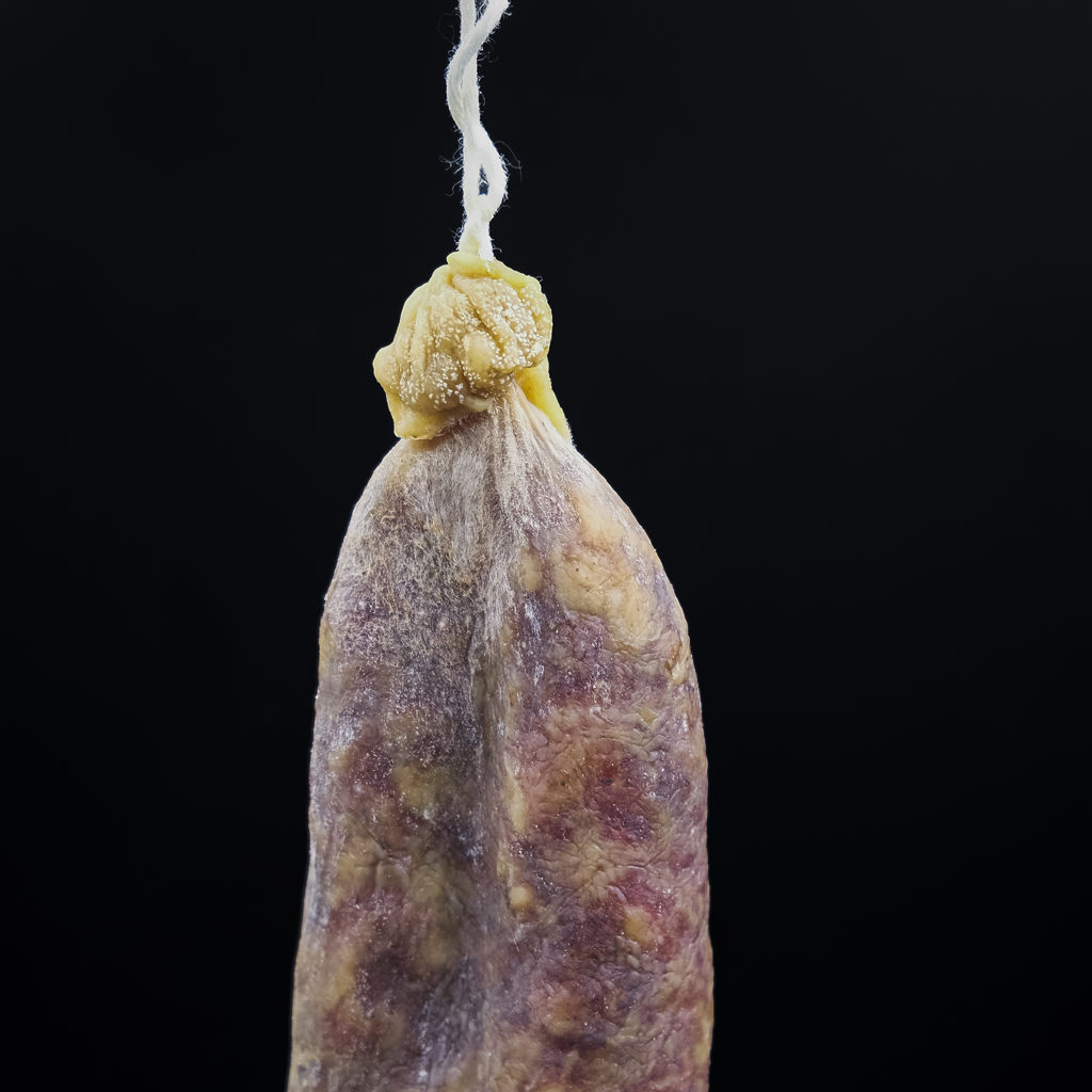 La Llonganissa de pagès és un dels grans emblemes de la xarcuteria tradicional del Lluçanès. Elaborada artesanalment amb les millors parts del porc —lloms, espatlles i pernils desgreixats—, se sala i s’amaneix amb pebre abans d’embotir-la en tripa natural. El procés de curació lent, a l’aire de muntanya, desenvolupa la seva textura ferma i un sabor intens, amb notes subtils de cansalada i un toc fúngic característic.